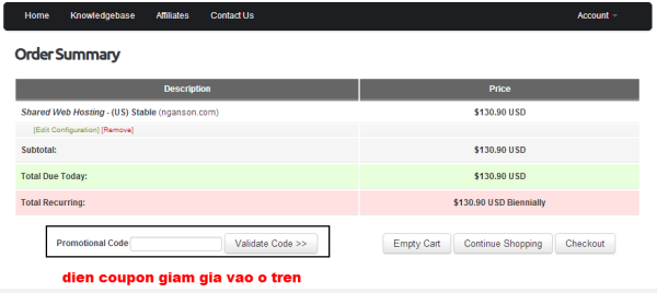 Sau khi điền coupon giảm giá: thì giá của gói host sẽ giảm xuống 1 nửa.
