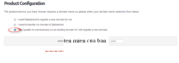 – Bước 4: Điền thông tin domain của bạn vào nếu như bạn chư có domain thì có thể đăng kí mua domain của StableHost hoặc có thể mua từ các nhà cung cấp dịch vụ khác.