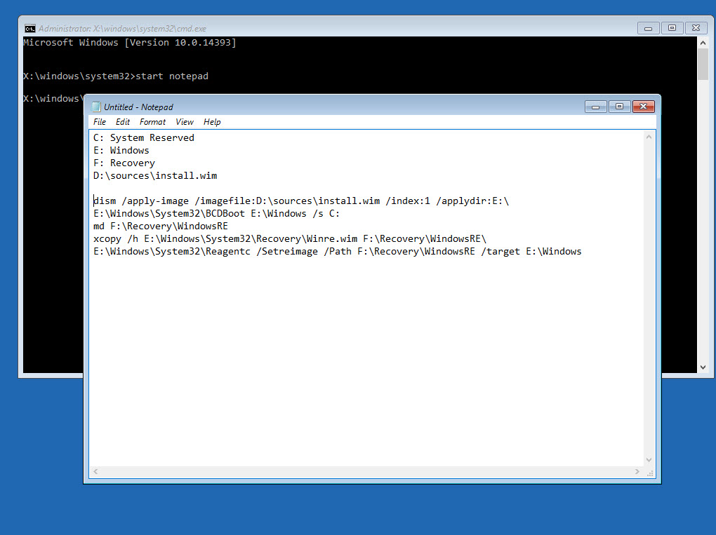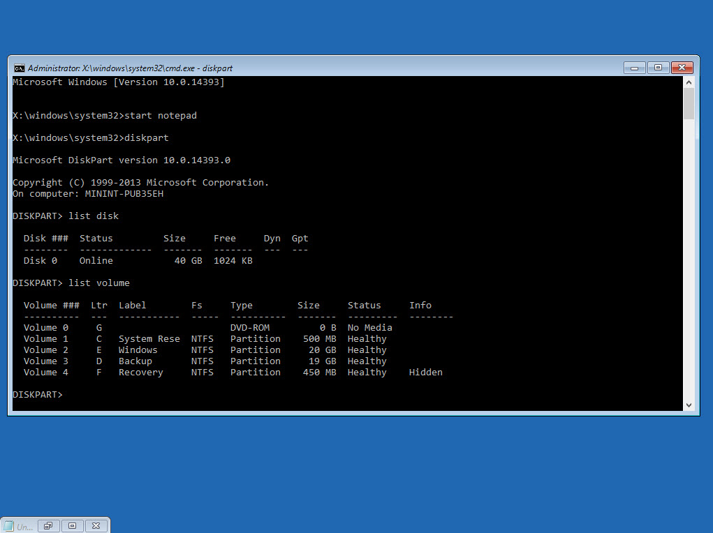 Như vậy sau khi xem danh sách các phân vùng bạn cần xác định phân vùng cài lại windows, phân vùng đang lưu file ảnh install.wim. Để tiết kiệm thời gian bản mở notepad ghi vào đó trước để sao copy paste cho nhanh.