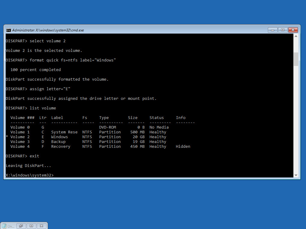 format quick fs=ntfs label=”Windows”